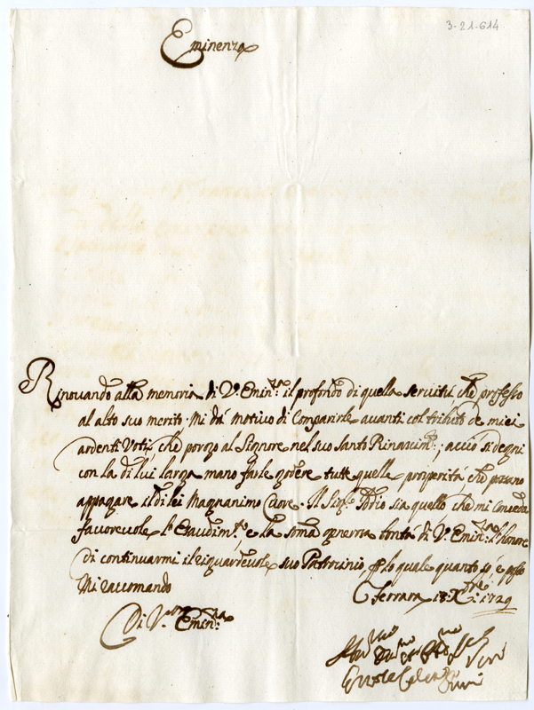 Lettera di Ercole Pieri al cardinale Annibale Albani (1729 dicembre 18)
