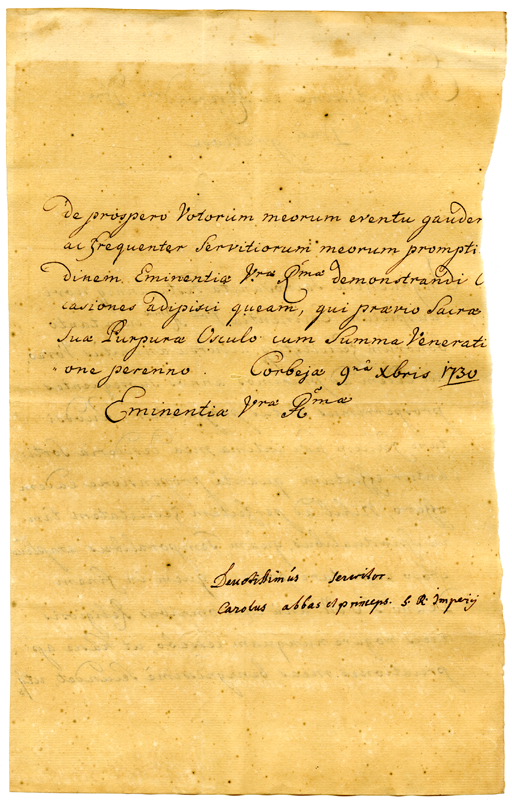 Lettera di Carlo abate e principe del Sacro Romano Impero al cardinale Annibale Albani (1730 dicembre 9)