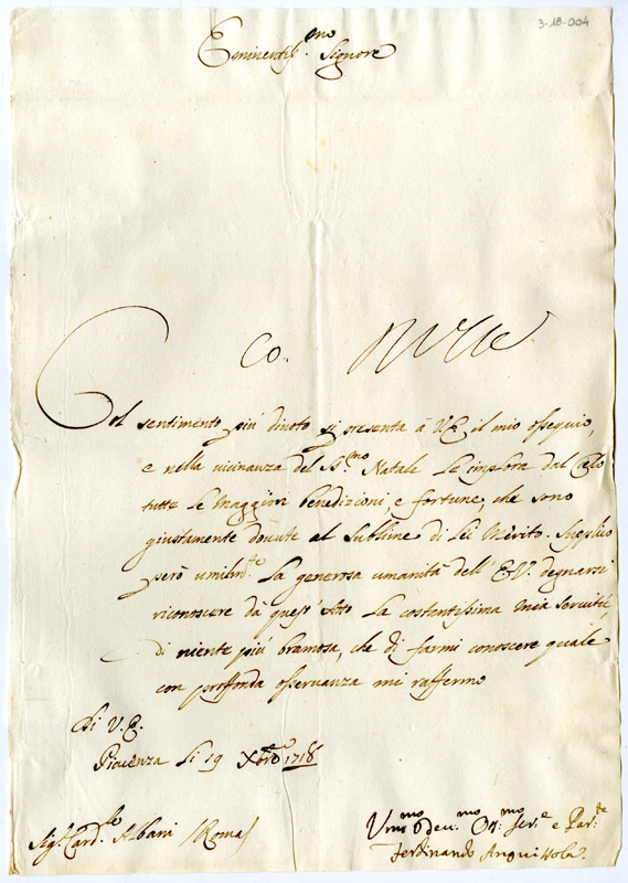 Lettera di Ferdinando Anguissola al cardinale Annibale Albani (1718 dicembre 19)