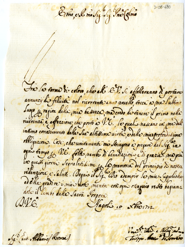 Lettera di Filippo vescovo di Sorrento al cardinale Annibale Albani (1712 dicembre 10)