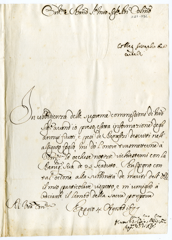 Lettera di Agostino Vescovo di Reggio ad un Cardinale (1699 agosto 4)
