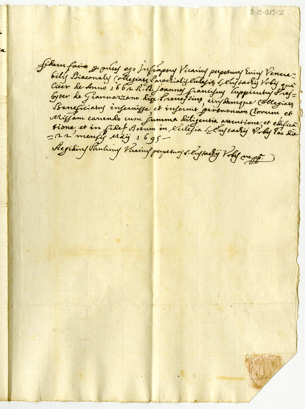 Attestato di Egidio Paolini sulla morte di Giovanni Francesco Lupicuti beneficiario della collegiata parrocchiale della Chiesa di Sant'Eustachio in Roma (1695 maggio 22)
