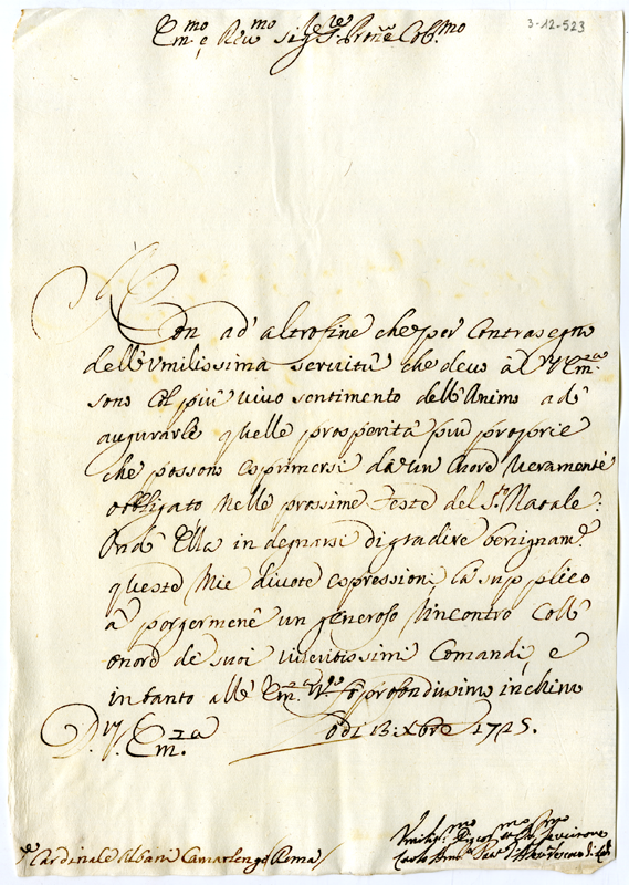 Lettera di Carlo Ambrogio vescovo di Lodi al cardinale Annibale Albani (1725 dicembre 13)