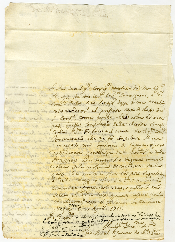 Lettera di Giovanni Battista Pisacane al Cardinale Annibale Albani (1715 aprile 27)