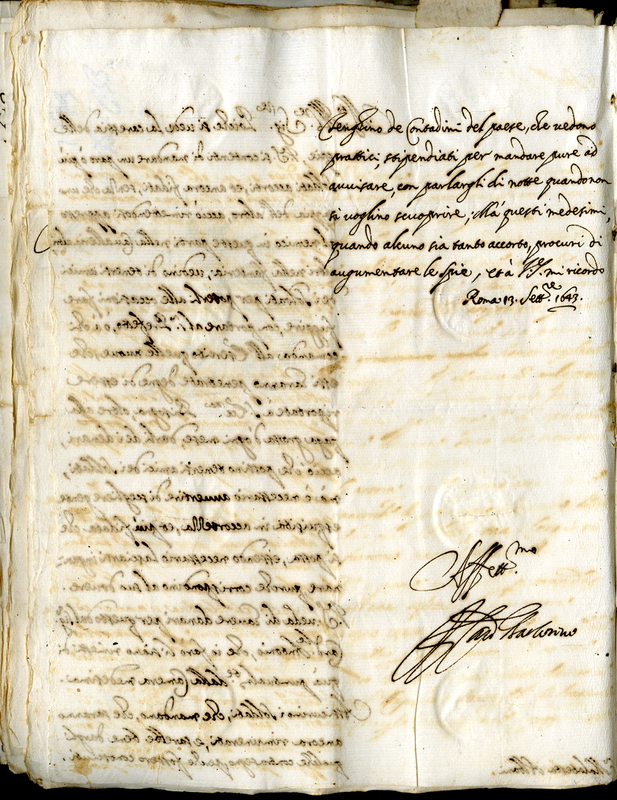 Lettera del cardinale Barberini Francesco senior a Malatesta Albani (1643 settembre 13)