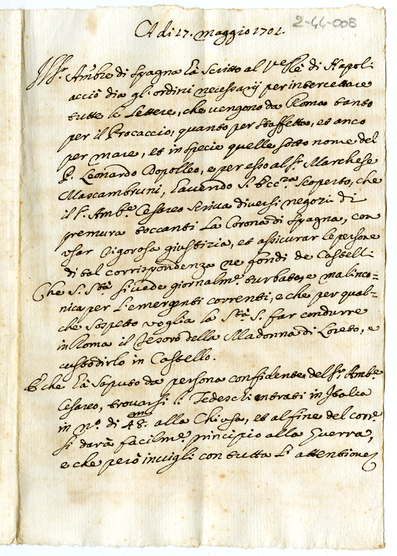 Sull'ordine dato dall'ambasciatore di Spagna al vice Re di Napoli di intercettare tutte le lettere provenienti da Roma. Da persona sicura si è saputo che i tedeschi in numero di 48000 sono entrati in Italia (1701 maggio 17)