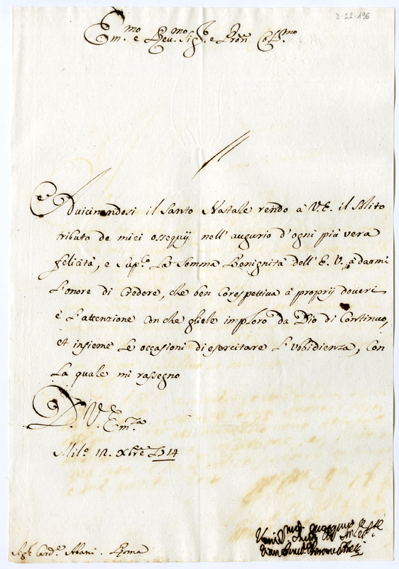 Lettera di Gian Benedetto Borromeo al cardinale Annibale Albani (1714 dicembre 12)