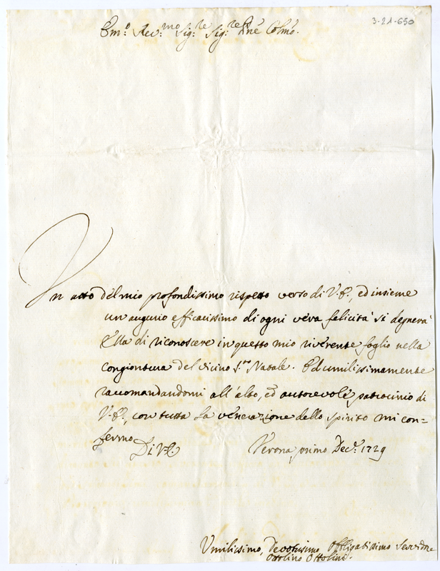 Lettera di Ottolino Ottolini al cardinale Annibale Albani (1729 dicembre 1)