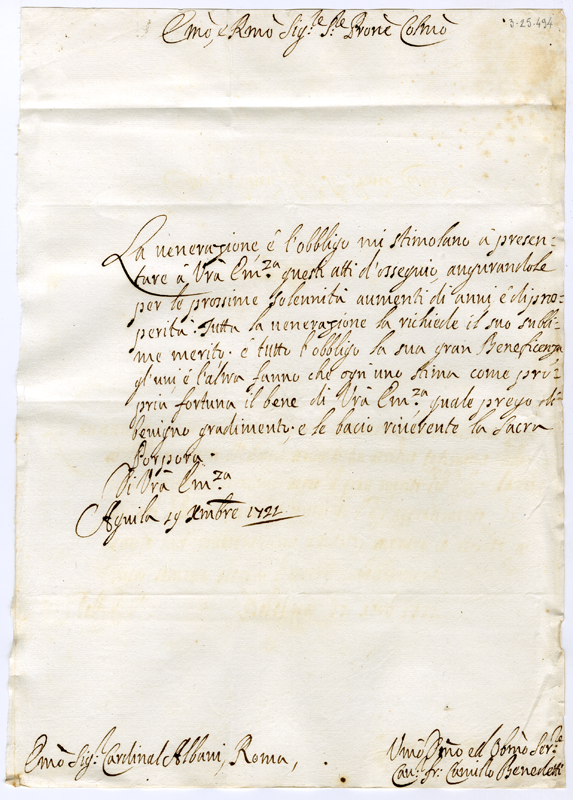 Lettera di Camillo Benedetti al cardinale Annibale Albani (1721 dicembre 19)