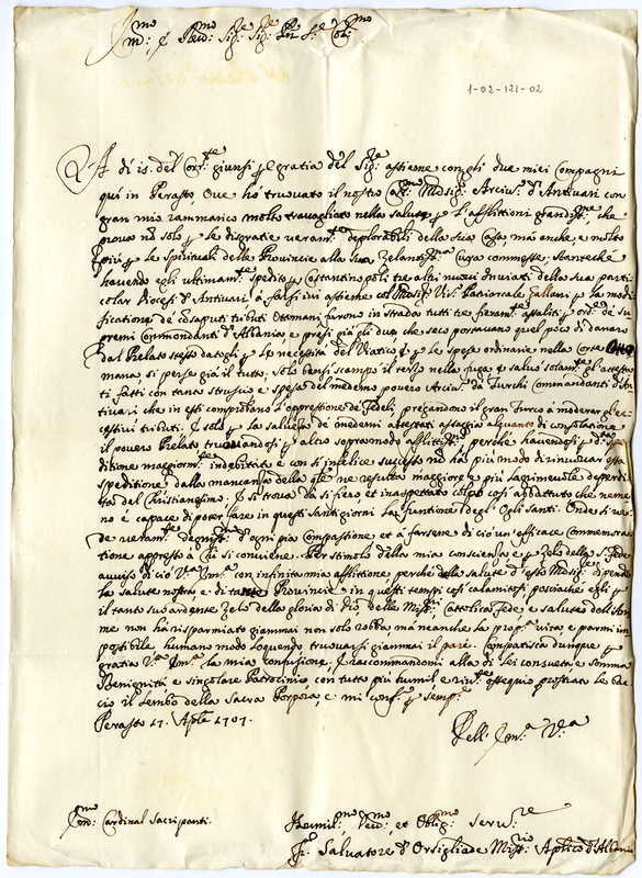 Francesco Salvatore d'Orsigliade, missionario apostolico d'Albania, chiede al cardinale Sacripanti di moderare gli eccessivi tributi.