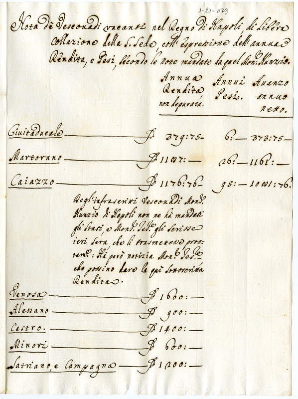 Nota de' Vescovadi vacanti nel Regno di Napoli, di libera collazione della Santa Sede coll'espressione dell'annua rendita, e pesi, secondo le note mandate da quel Monsignor Nunzio (1700-1721)