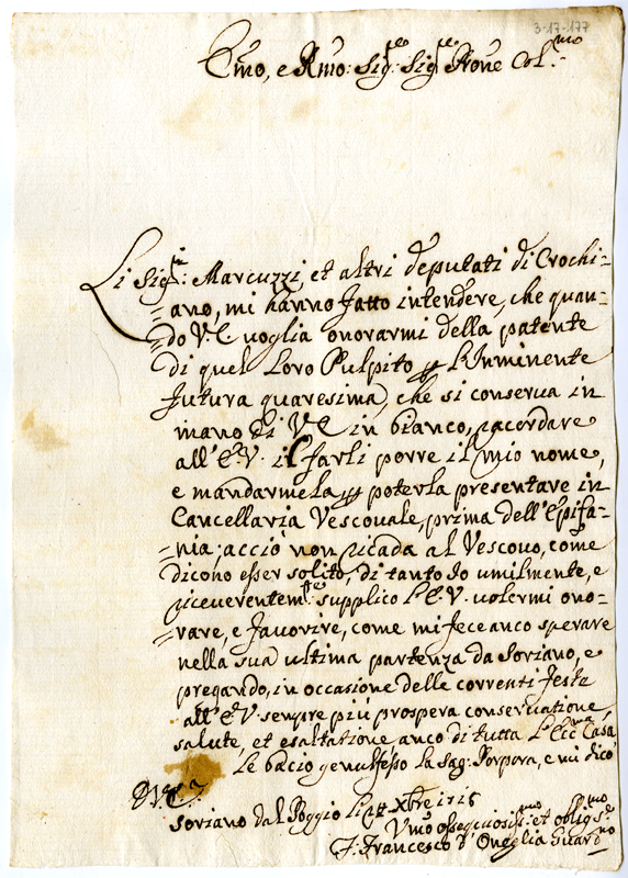 Oltre agli auguri per le prossime feste, chiede di poter avere per l'epifania la patente per predicare la quaresima a Crocchiano.