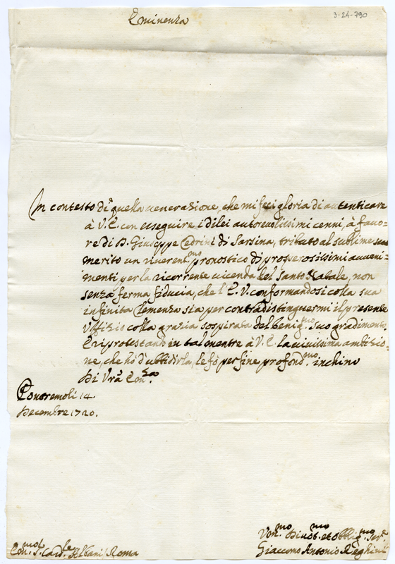 Lettera di Giacomo Antonio Reghini al cardinale Annibale Albani (1720 dicembre 14)