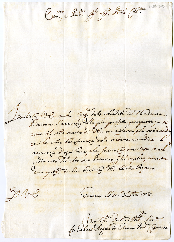 Lettera di fra Gabriele Angelo da Genova cappuccino ad Annibale Albani (1718 dicembre 20)