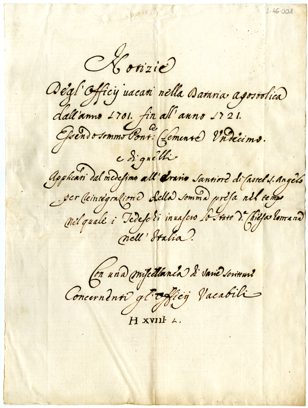 Notizie degl'Officii vacati nella Dataria Apostolica dall'anno 1701 fin all'anno 1721. Essendo sommo Pontefice Clemente Undecimo e di quelli applicati dal medesimo all'Erario Santiore di Castel S. Angelo per reintegrazione della somma presa in tempo nel quale i Tedeschi invasero lo Stato della Chiesa Romana nell'Italia. Con una miscellanea di varie scritture concernenti gl'Officii Vacabili
