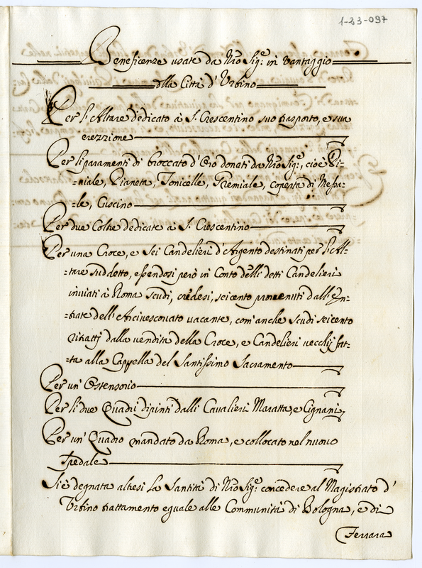Beneficenze usate da Nostro Signore in vantaggio della città d'Urbino (1700-1721)