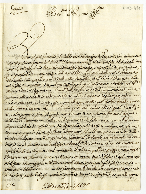 Supplica il cardinale di intervenire contro il cattivo comportamento del padre maestro Giarnieri nel convento di s. Francesco di San Severo
