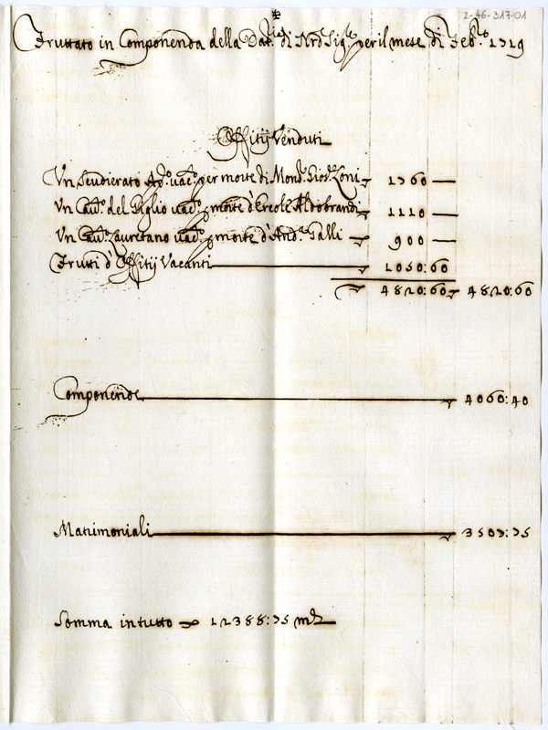 Fruttato in Componenda della Dateria di Nostro Signore per il mese di Febbraro1719
