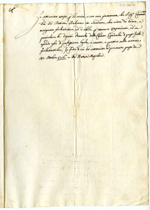 Attestato di integrità sacerdotale in favore di Giovanni Battista Balsani. Copia (1716 ottobre 31)