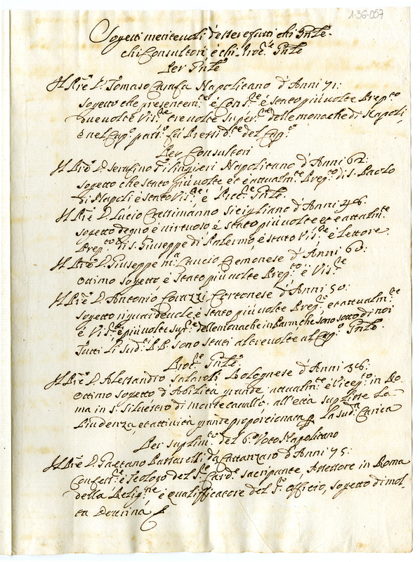 Soggetti meritevoli d'essere fatti chi Generale, chi Consultore, e chi Procuratore Generale (1700-1721)