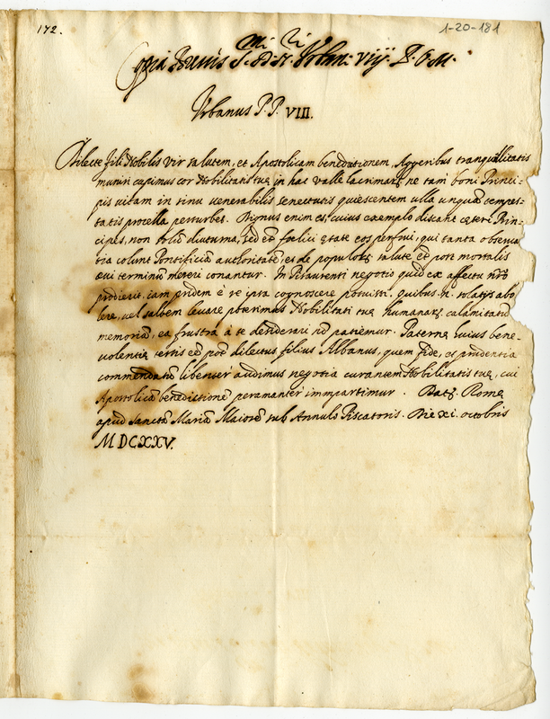 Copia di un breve di Urbano VIII a Francesco Maria Duca di Urbino (1625 ottobre 11)