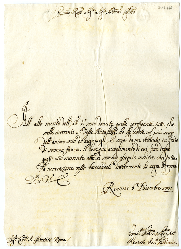 Lettera di Renato vescovo di Rimini al cardinale Annibale Albani (1731 dicembre 6)