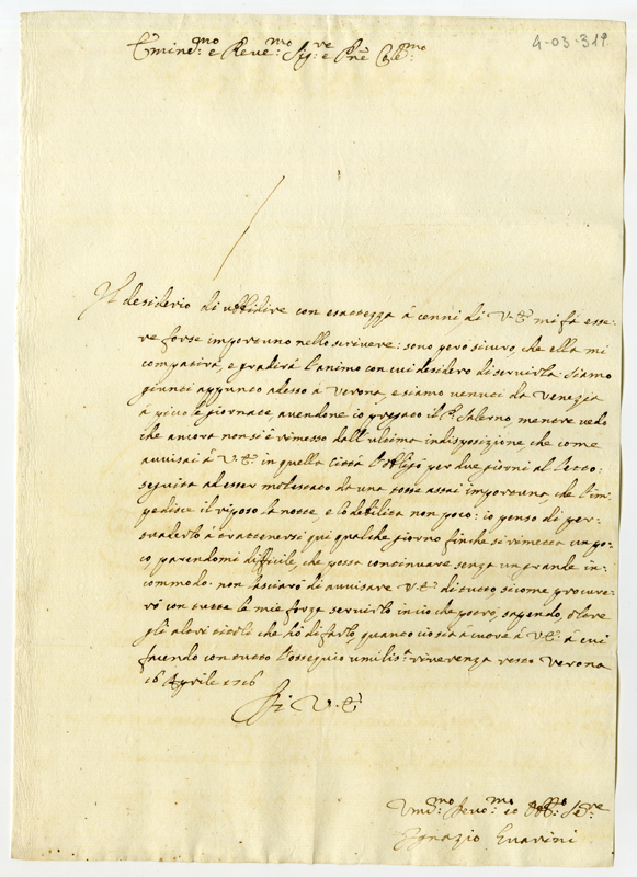 Lettera di Ignazio Guarini al Cardinale Annibale Albani (1716 aprile 16)