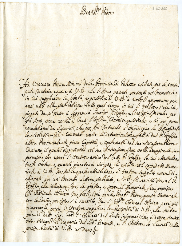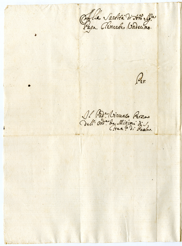 Lettera del padre Vincenzo Perna minimo della provincia di Palermo a papa Clemente XI (1700-1721)