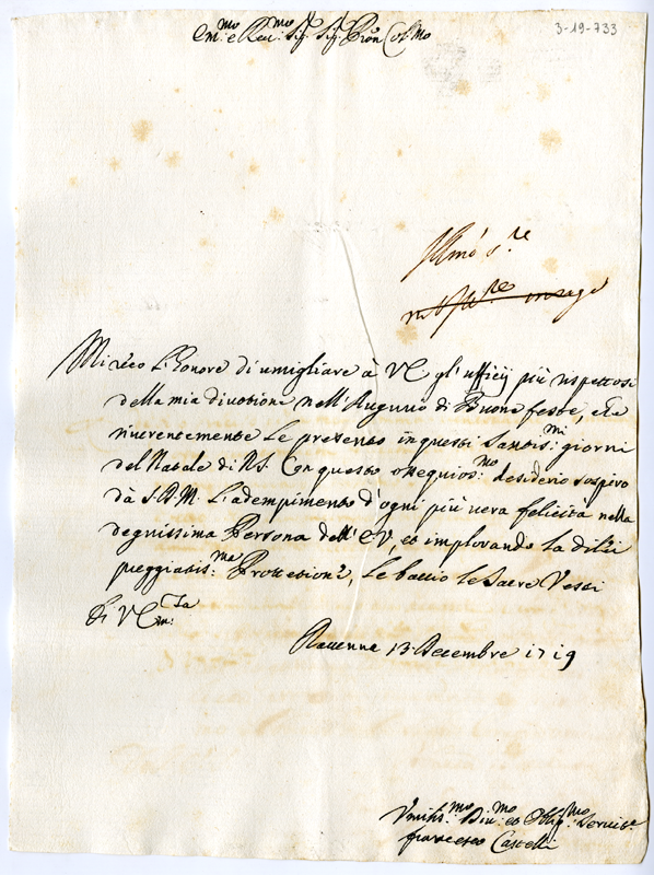 Lettera di Francesco Castelli ad Annibale Albani (1719 dicembre 13)