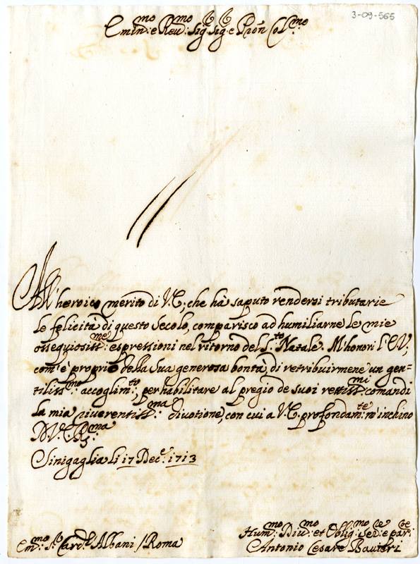 Lettera di Antonio Cesare Bavieri al cardinale Annibale Albani (1713 dicembre 17)