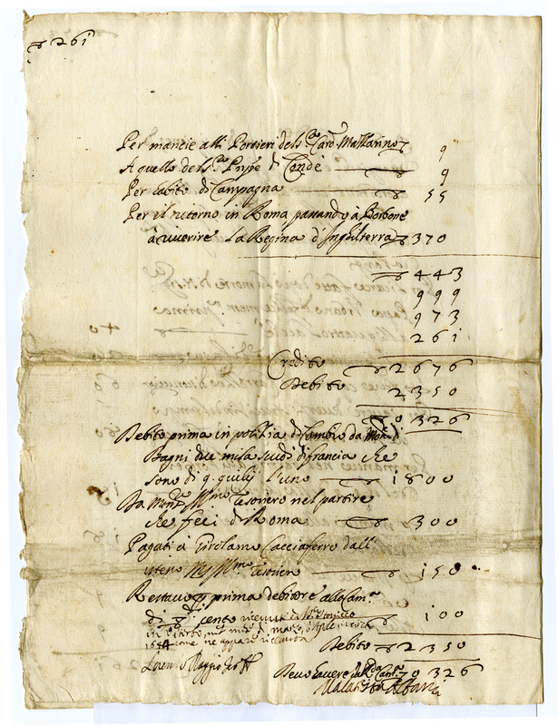 Spesa fatta per servigio di Sua Santità nel viaggio di Francia, e dimora in Parigi e ritorno a Roma da Malatesta Albani àdi 27 maggio 1644