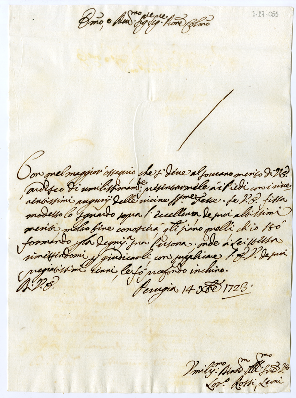 Lettera di Lorenzo Rossi Leoni al cardinale Annibale Albani (1723 dicembre 14)