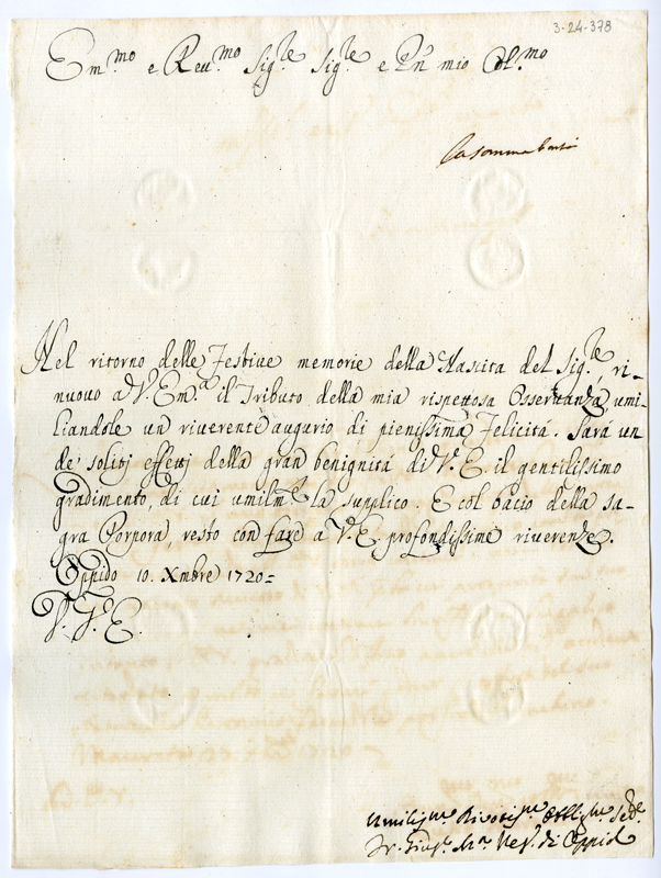 Lettera di Giuseppe Maria vescovo di Oppido al cardinale Annibale Albani (1720 dicembre 10)