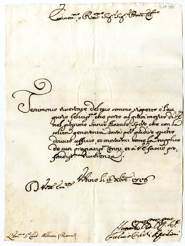 Lettera di Fulvio Corboli Aquilini al cardinale Annibale Albani (1718 dicembre 16)