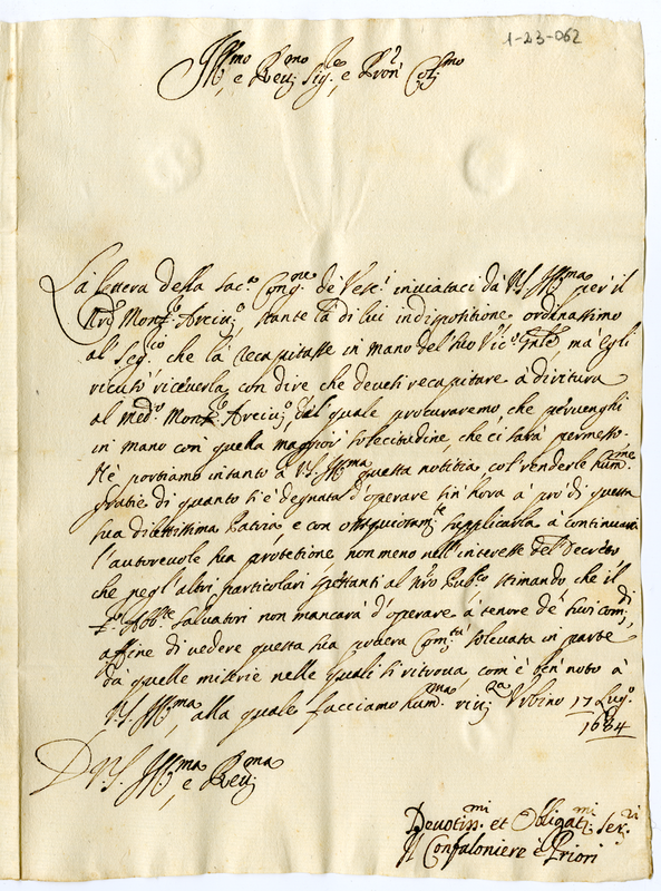 Lettera del gonfaloniere e priori a Giovanni Francesco Albani (1684 luglio 17)