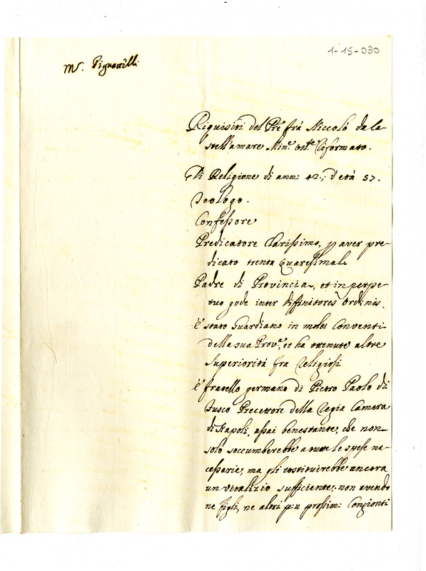 Requisiti del Pre. Frà Niccolò da Castell'Amare Min. e ass. riformato