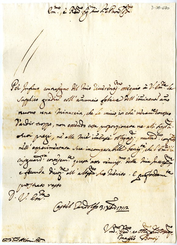 Lettera di Maffeo Bonti al cardinale Annibale Albani (1712 dicembre 31)