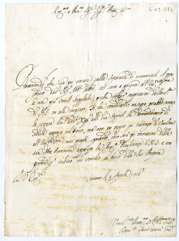 Lettera di Domenico Sandreani al Cardinale Annibale Albani (1716 aprile 3)