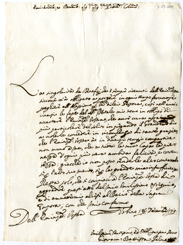 Lettera di Giovanni Battista Palma ad Annibale Albani (1719 dicembre 18)