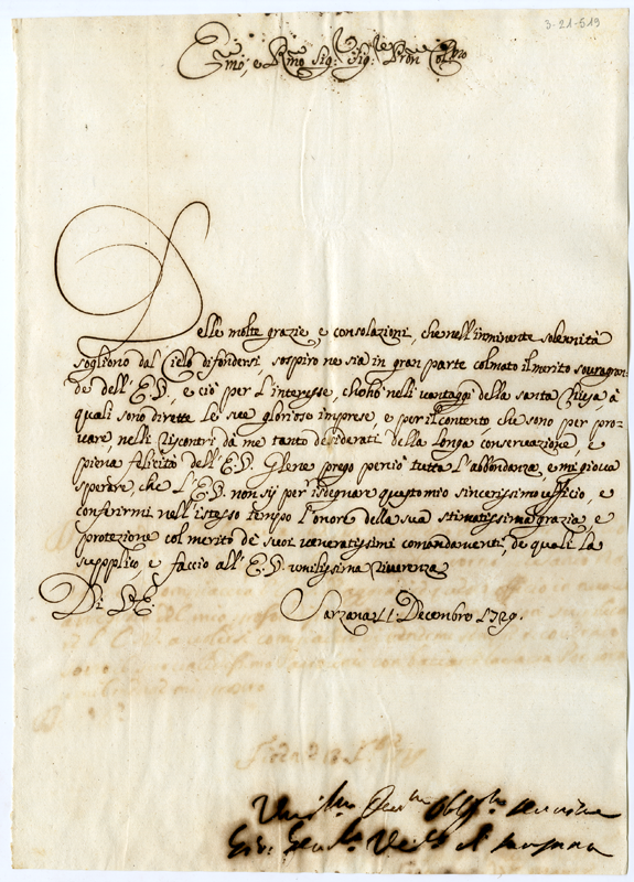 Lettera di Giovanni Girolamo vescovo di Sarzana al cardinale Annibale Albani (1729 dicembre 11)