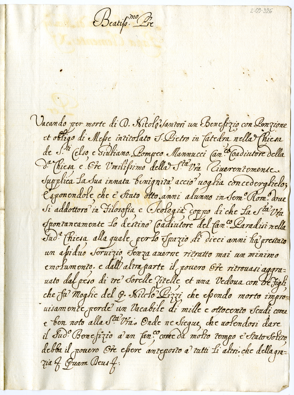 Chiede di poter avere il beneficio di San Pietro in Cattedra nella chiesa di San Celso e Giuliano vacato per morte di Nicolò Santori