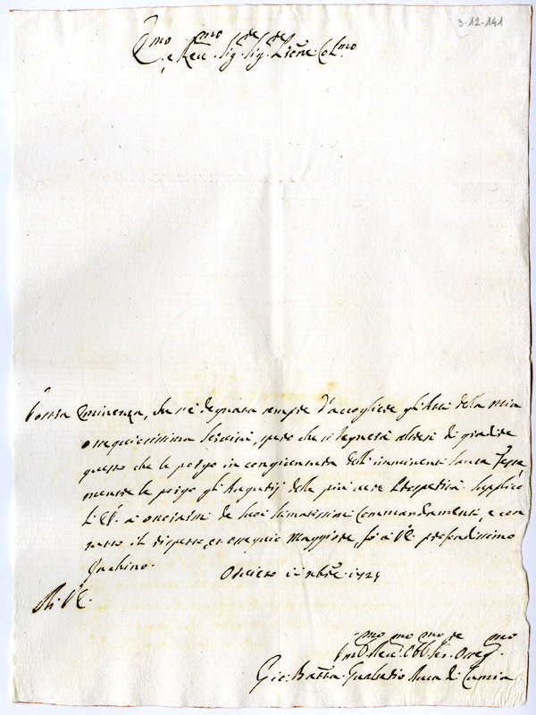 Lettera di Giovanni Battista Gualuzio duca di Cumia al cardinale Annibale Albani (1725 dicembre 11)