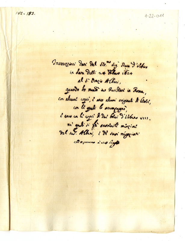 Instruzzioni date dal Serenissimo Signor Duca d'Urbino in data delli 24 febbraro 1624 al Signor Orazio Albani, quando lo mandò suo Residente in Roma, con alcune copie, e anco alcuni originali di lettere, con le quali lo accompagnò, e anco con le copie di due brevi d'Urbano VIII nè quali si fà onorevole menzione dal suddetto Albani, e dè suoi negoziati che si porranno a suoi luoghi