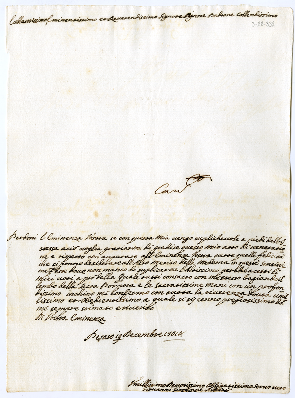 Lettera di Giovanni Giuseppe Ardizi al cardinale Annibale Albani (1714 dicembre 19)