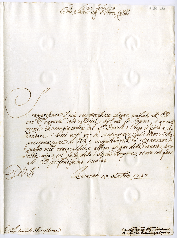 Lettera di Benedetto vescovo di Recanati e Loreto al cardinale Annibale Albani (1727 dicembre 12)