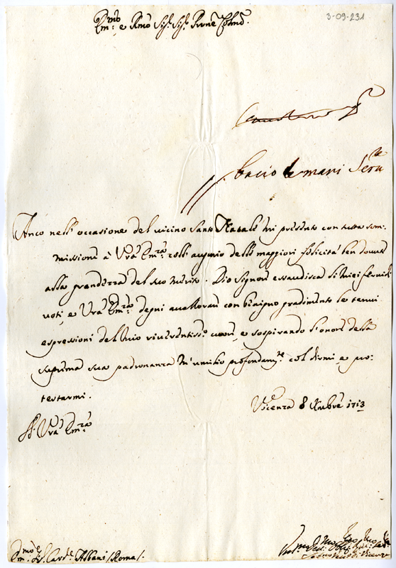 Lettera di Sebastiano vescovo di Vicenza al cardinale Annibale Albani (1713 dicembre 8)