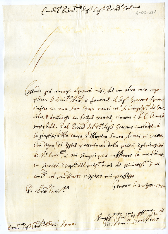 Lettera di Giovanni Domenico Lomellino al Cardinale Annibale Albani (1715 agosto 3)