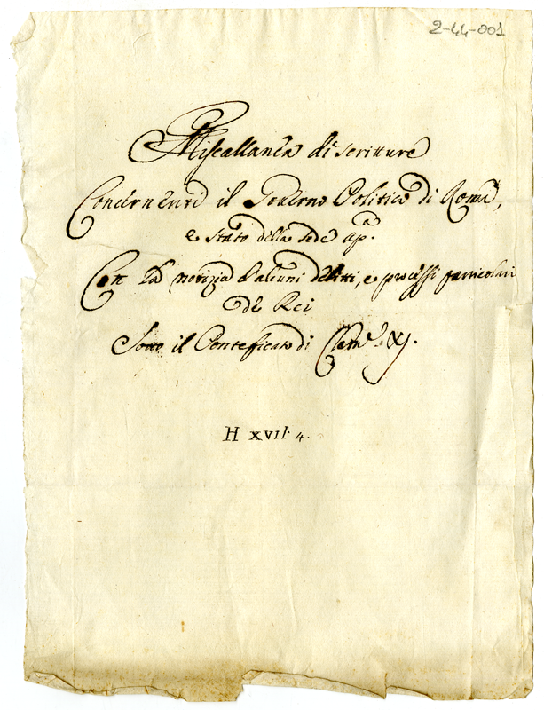 | bo.livello.titolo2 | Archivio Albani|"Miscellanea di scritture Concernenti il Governo Politico di Roma, e Stato della Sede Apostolica Con la notizia di alcuni delitti, e processi particolari de Rei Sotto il Pontificato di Clemente XI"|Documenti contenuti | |