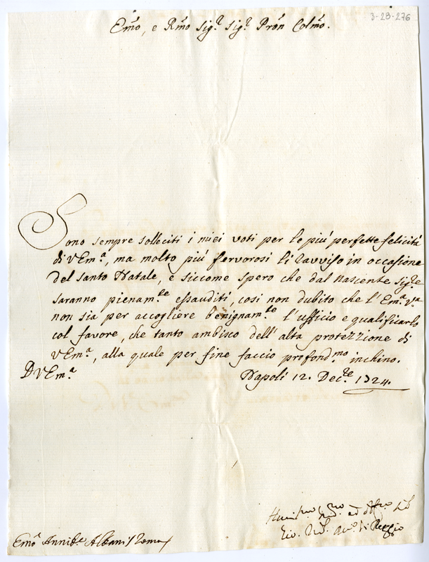 Lettera di Giovanni arcivescovo di Reggio al cardinale Annibale Albani (1724 dicembre 12)