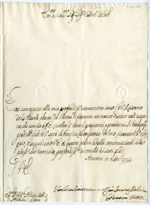 Lettera di Giovanni Mattei al cardinale Annibale Albani (1727 dicembre 10)